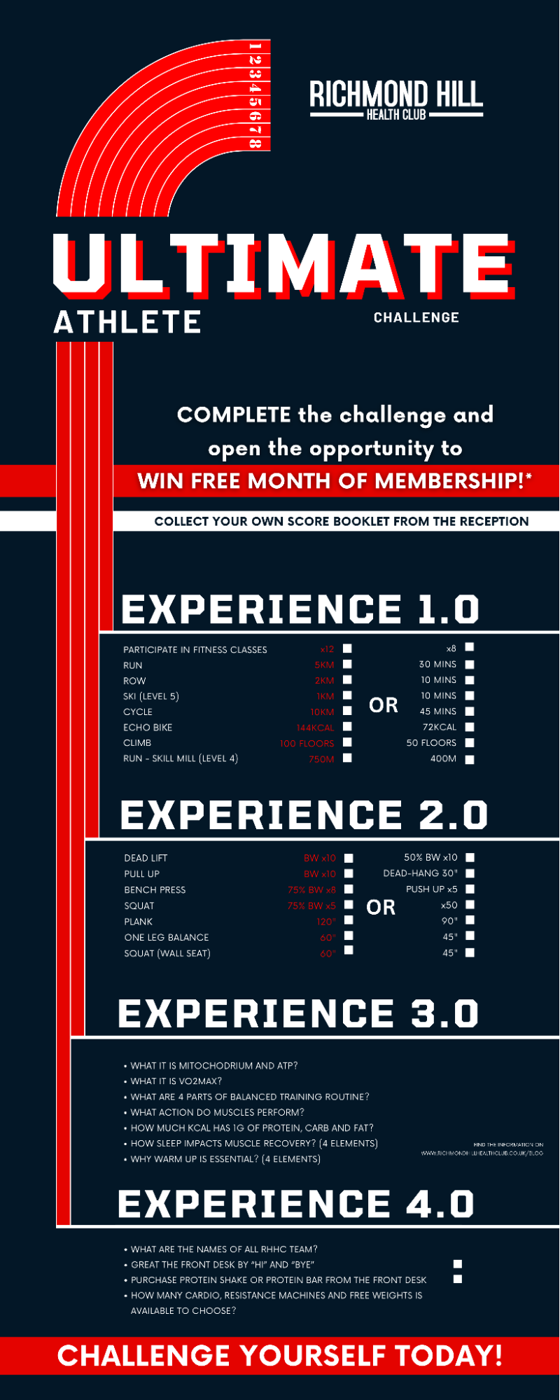 At Richmond Hill Health Club, we love a challenge. It’s a great way to motivate one another and bring in a bit of healthy competition into the mix, helping us all move closer to our fitness goals. This April-May, we’re inviting our members to take on the Ultimate Athlete Challenge.